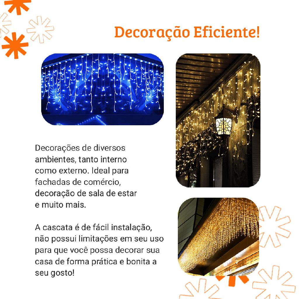 Outro destaque é sua conexão macho e fêmea, que permite ligar até 3 cascatas juntas, ampliando o alcance para impressionantes 30 metros de iluminação contínua! Resistente à água, você pode usar a cascata tranquilamente em áreas externas, sem se preocupar com o clima.