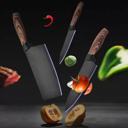 O kit faqueiro de cozinha é fabricado em aço inoxidável, sua lâmina possui ondulações que prolongam a durabilidade e resistência ao uso. O cabo revestido tem um toque Firme e encaixa perfeitamente a mão. Seu design arrojado da um toque de elegância, seja para sua cozinha ou para área de churrasco.