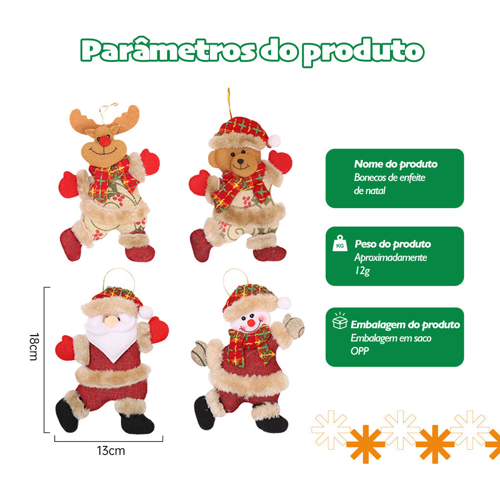 **Kit 4 Enfeites de Natal: Boneco Papai Noel, Rena, Boneco de Neve e Ursinho – Decoração para Árvore Natalina**